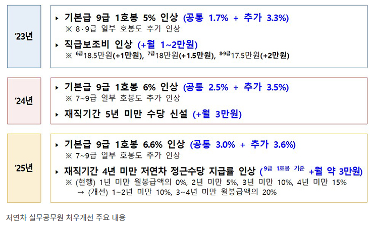 이미 2024년 연말 정책보도자료에 의하면 공무원 보수를 2025년에 3% 인상함과 동시에, 저연차 실무 공무원의 처우도 개선될 것이라 고지한 바 있습니다. 특히 9급 봉급액을 전년 대비 6.6% 인상하는 등 7~9급에 해당하는 저연차 공무원의 봉급을 추가로 인상한다고 전했습니다. 이를 통해 9급 초임 봉급은 처음으로 200만 원을 넘게 됩니다.