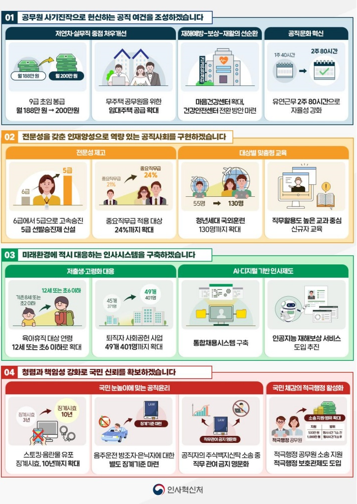 이러한 처우 개선을 통해 공무원의 사기 진작과 함께 우수 인재의 공직 유입을 촉진할 것으로 기대됩니다. 인사혁신처는 앞으로도 공무원의 근무 환경과 처우 개선을 위한 다양한 정책을 지속적으로 추진할 예정입니다.